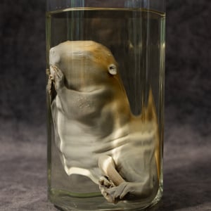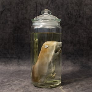 This baby beaver has been professionally preserved and is now sitting in 70% isopropyl alcohol.