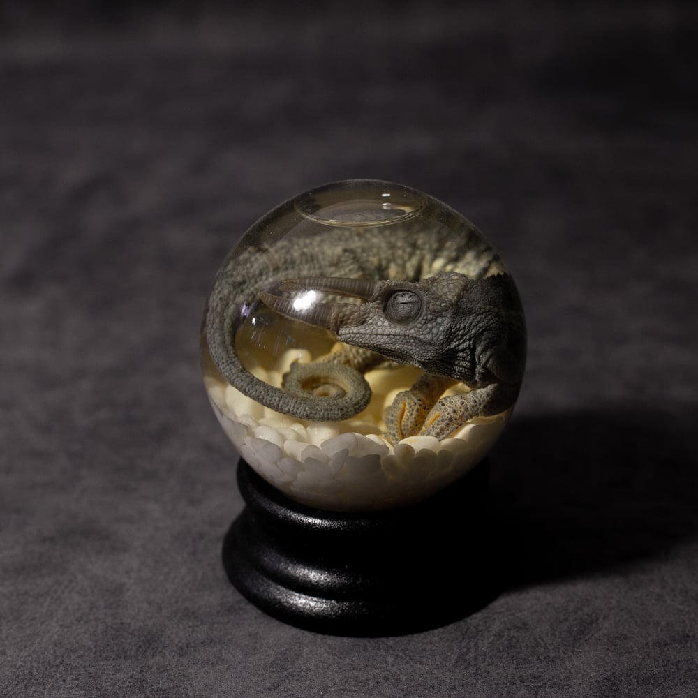 This male Jacksons chameleon has been professionally preserved and now sits in 70% isopropyl alcohol.