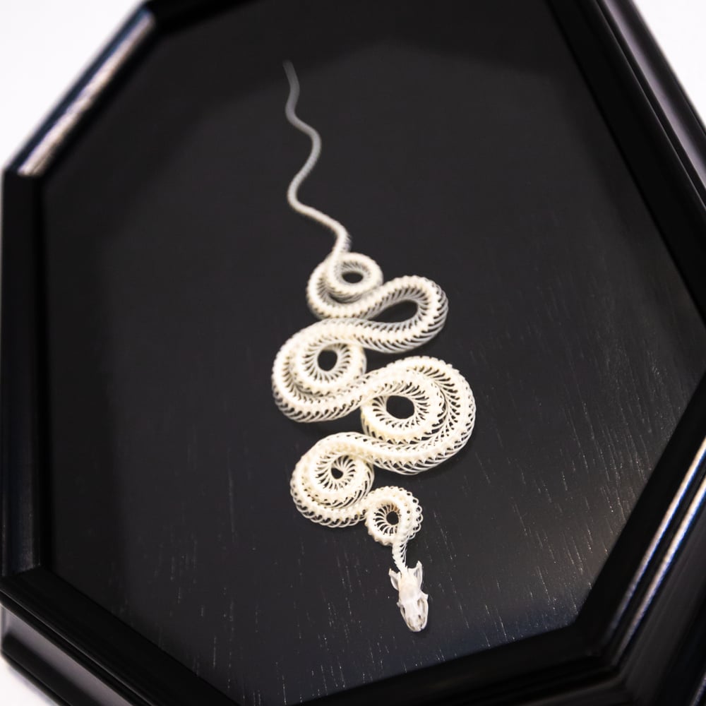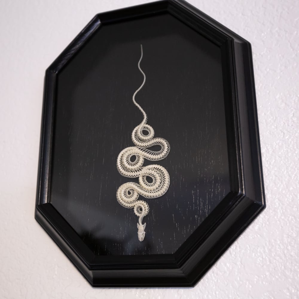 This juvenile corn snake died naturally and has been beetle cleaned, degreased, whitened and articulated by yours truly. This corn snake skeleton features incredible detail and a mesmerizing coiled pose! Housed in a custom black octagonal frame and is ready to become the centerpiece of your collection!
