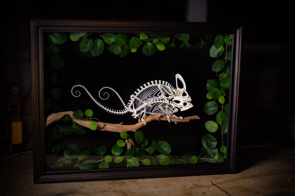 Ive been wanting to create this piece for some time now. We have a male and female chameleon "mating" which are displayed nicely inside this shadow box that measures 17" long, 3.3" deep by 12.5" tall. Both male and female chameleon died naturally and have been professionally cleaned and articulated. This is definitely a rare and one of a kind piece!